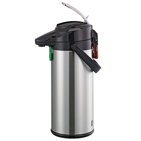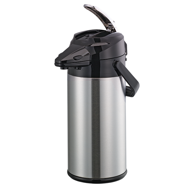 Termo dispensador para café, capacidad de 2.2 litros con revestimiento de vidrio. Cuenta con una cubierta exterior de acero inoxidable, que proporciona una capa adicional para proteger el interior de vidrio.